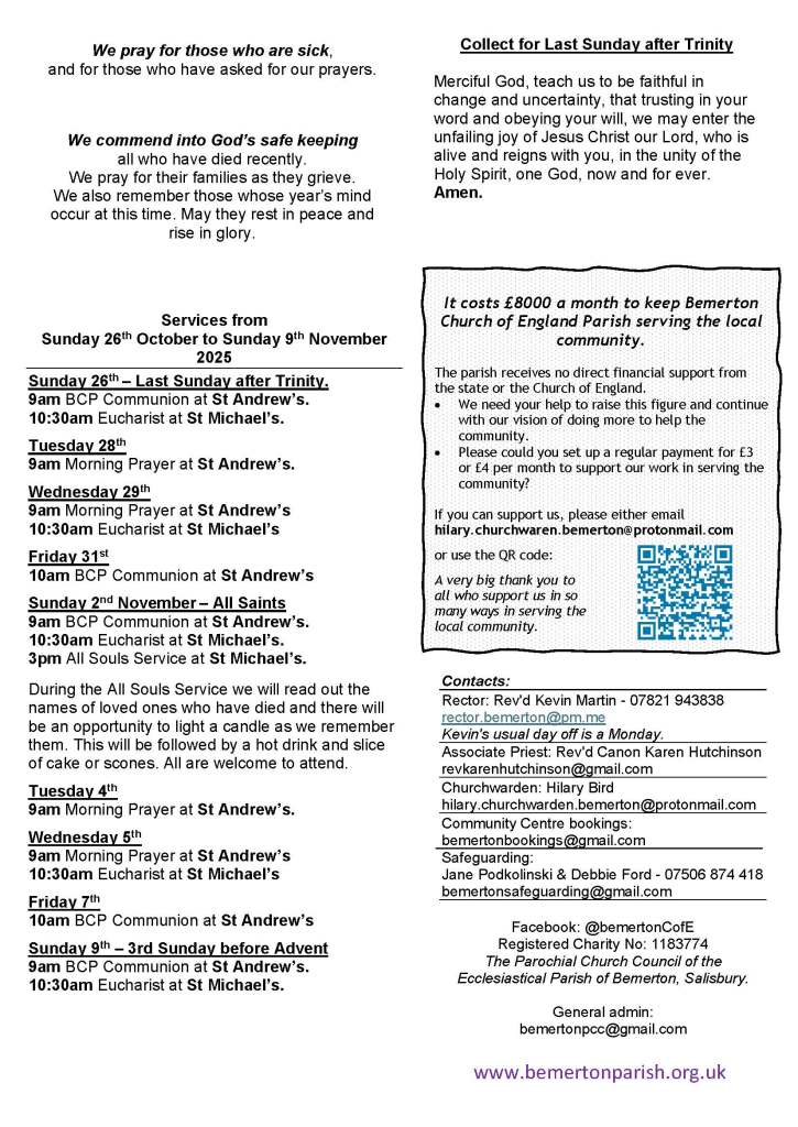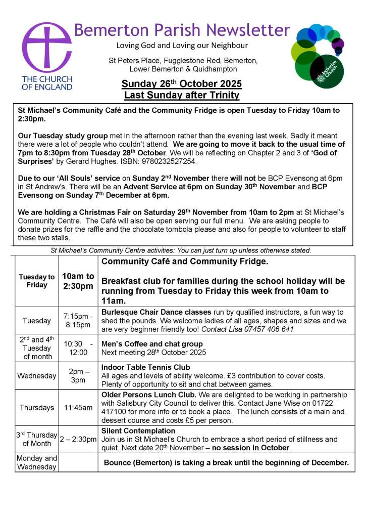 10:30am Eucharist at St Michael’s Church, Bemerton Heath. A service using modern English which lasts around 60 to 70 minutes. We have four hymns during the service and some other singing but you don’t have to join the singing if you would prefer not to.