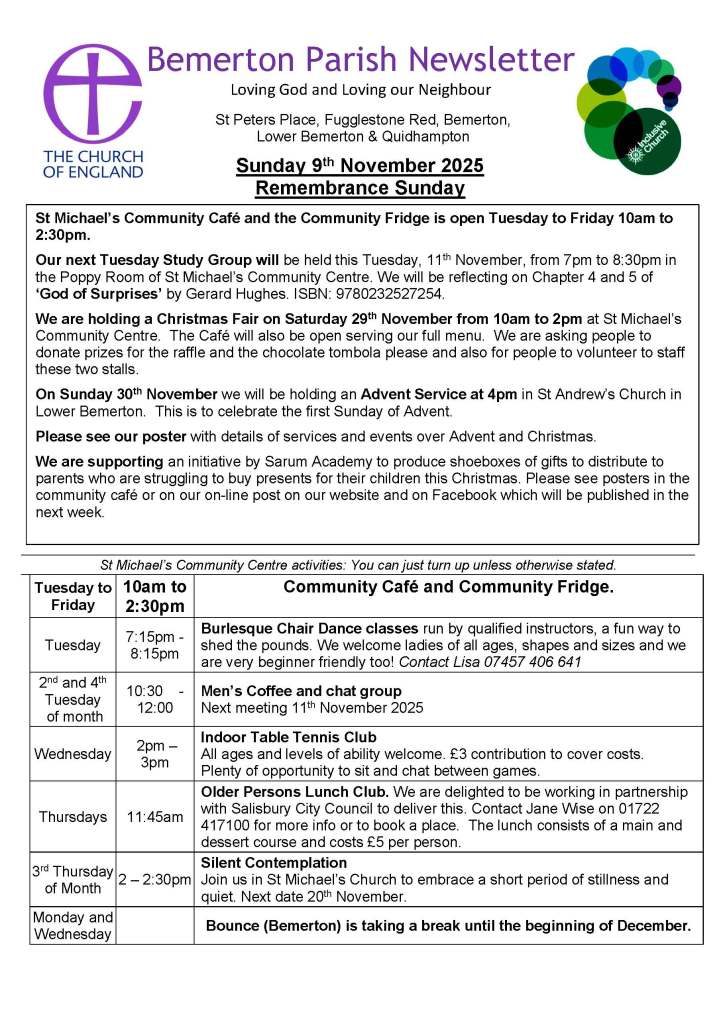 10:30am Eucharist at St Michael’s Church, Bemerton Heath. A service using modern English which lasts around 60 to 70 minutes. We have four hymns during the service and some other singing but you don’t have to join the singing if you would prefer not to. During the service we will have an act of remembrance including a two minute silence at 11am.