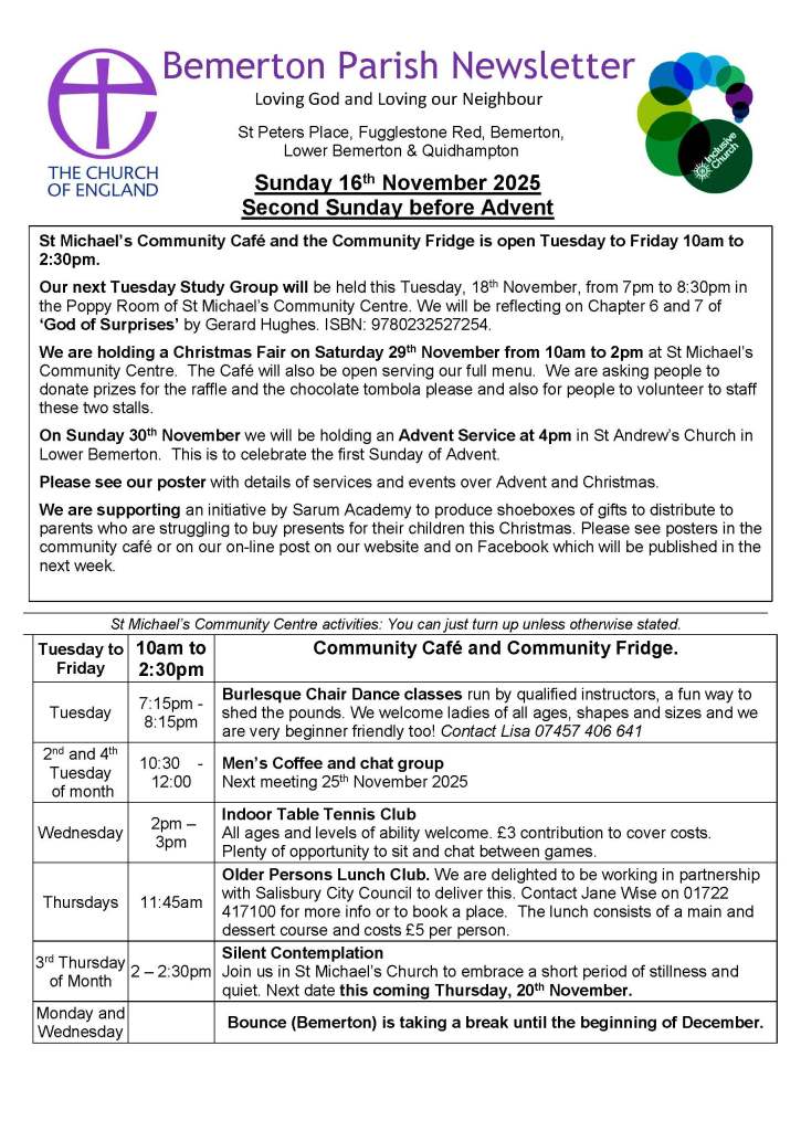 10:30am Eucharist at St Michael’s Church, Bemerton Heath. A service using modern English which lasts around 60 to 70 minutes. We have four hymns during the service and some other singing but you don’t have to join the singing if you would prefer not to.