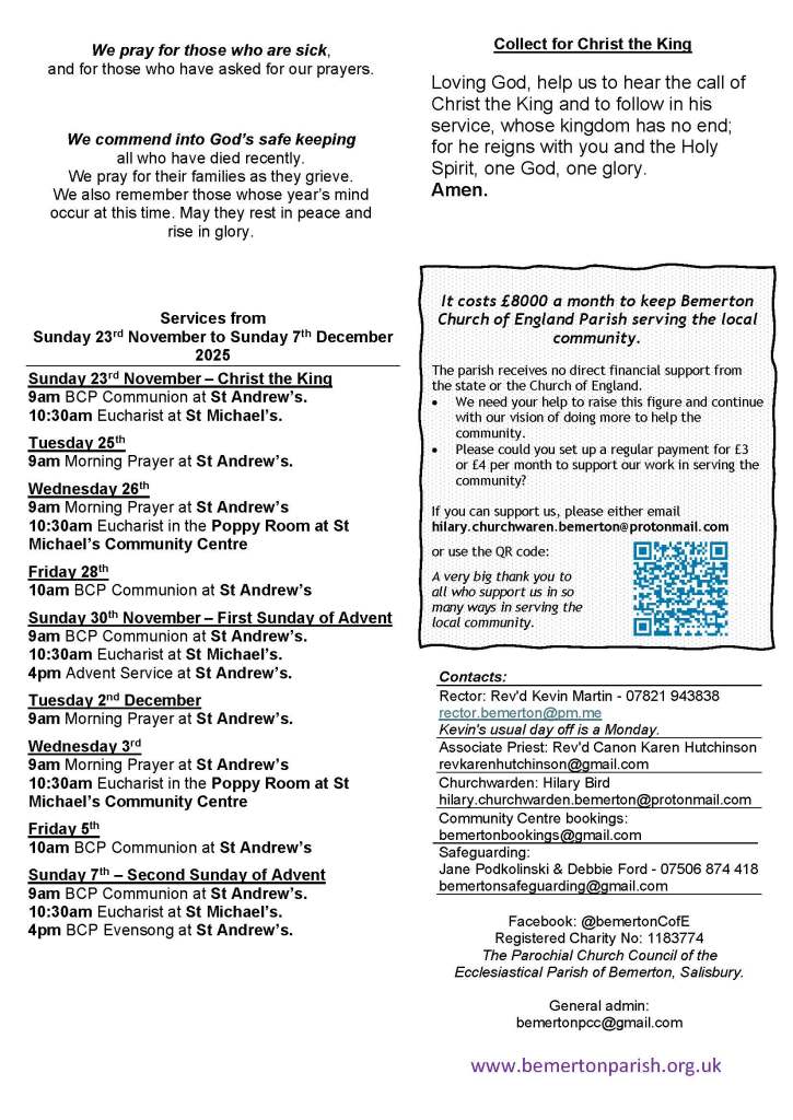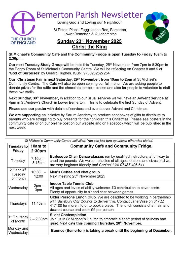 10:30am Eucharist at St Michael’s Church, Bemerton Heath. A service using modern English which lasts around 60 to 70 minutes. We have four hymns during the service and some other singing but you don’t have to join the singing if you would prefer not to.