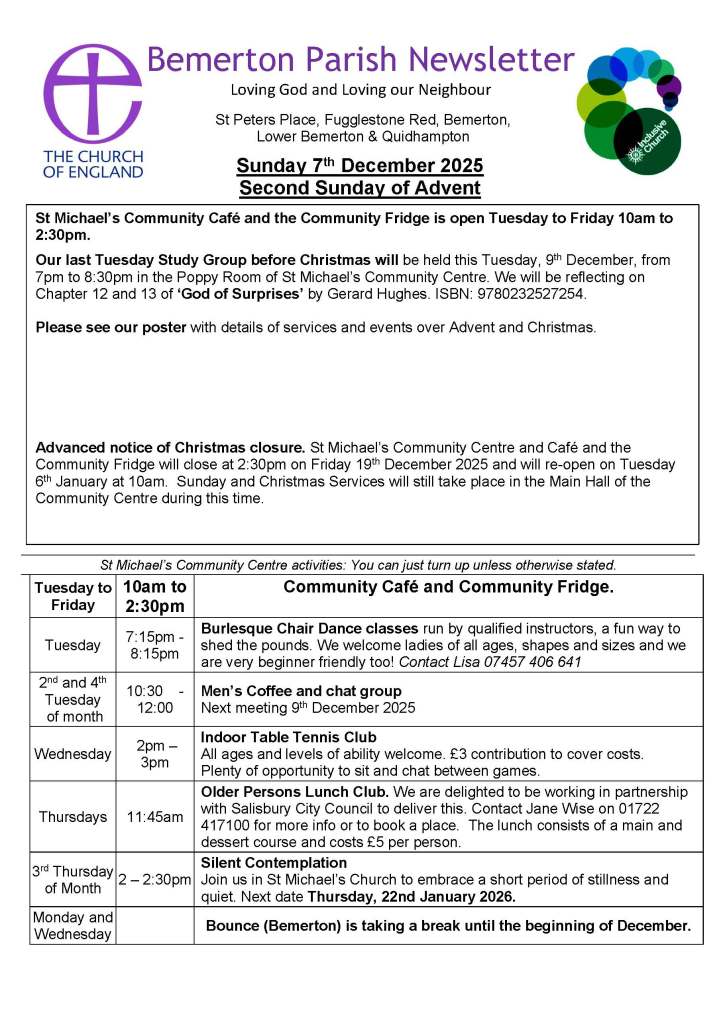 10:30am Eucharist at St Michael’s Church, Bemerton Heath. A service using modern English which lasts around 60 to 70 minutes. We have four hymns during the service and some other singing but you don’t have to join the singing if you would prefer not to.