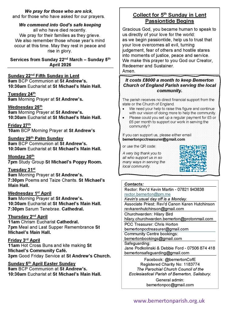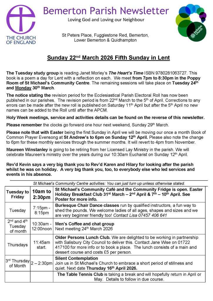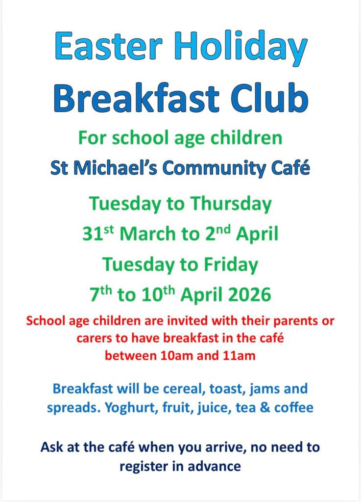 10:30am Eucharist at St Michael’s Community Centre Main Hall. A service using modern English and lasting 60 to 70 minutes. There are four hymns/songs with some other singing but you don’t have to sing if you prefer not to. Refreshments will be served afterwards.